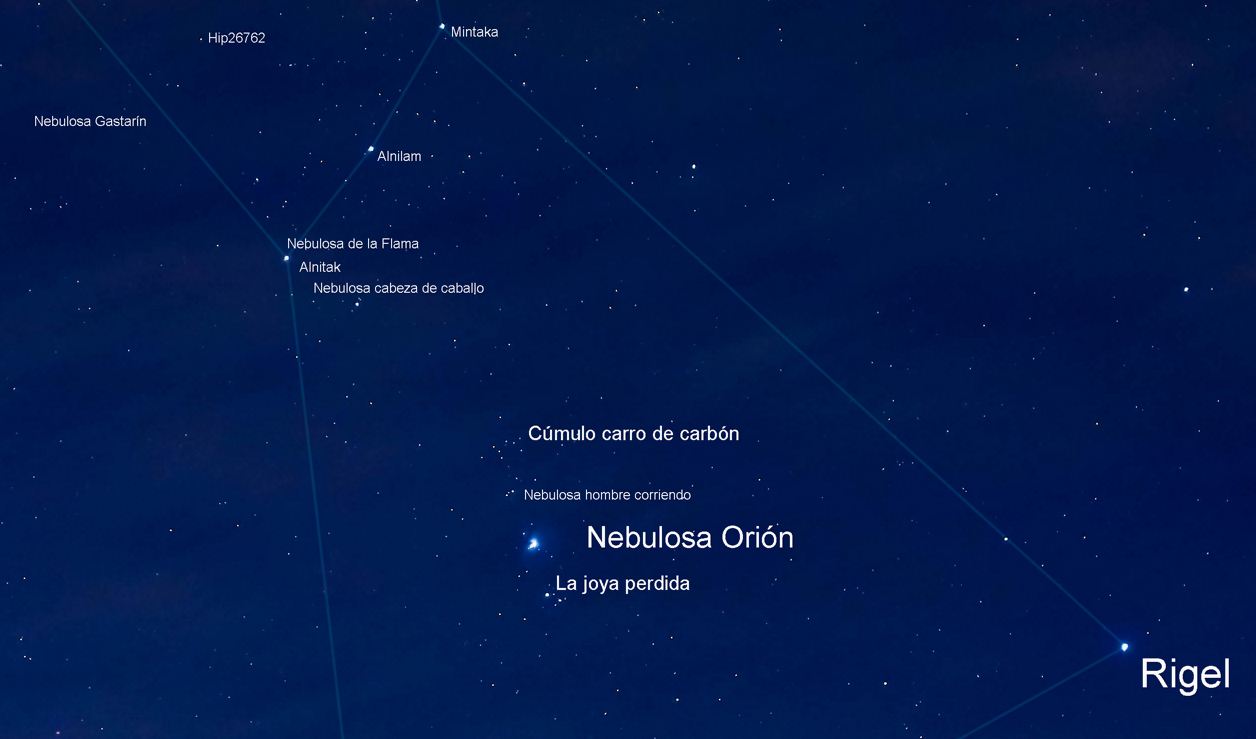 Orión: Una de las constelaciones más interesantes del cielo de invierno es Orión. Lo reconoceremos facilmente por las tres estrellas que forman el llamado cinturón de Orión. Las tres de un brillo parecido y alineadas casi perfectamente.