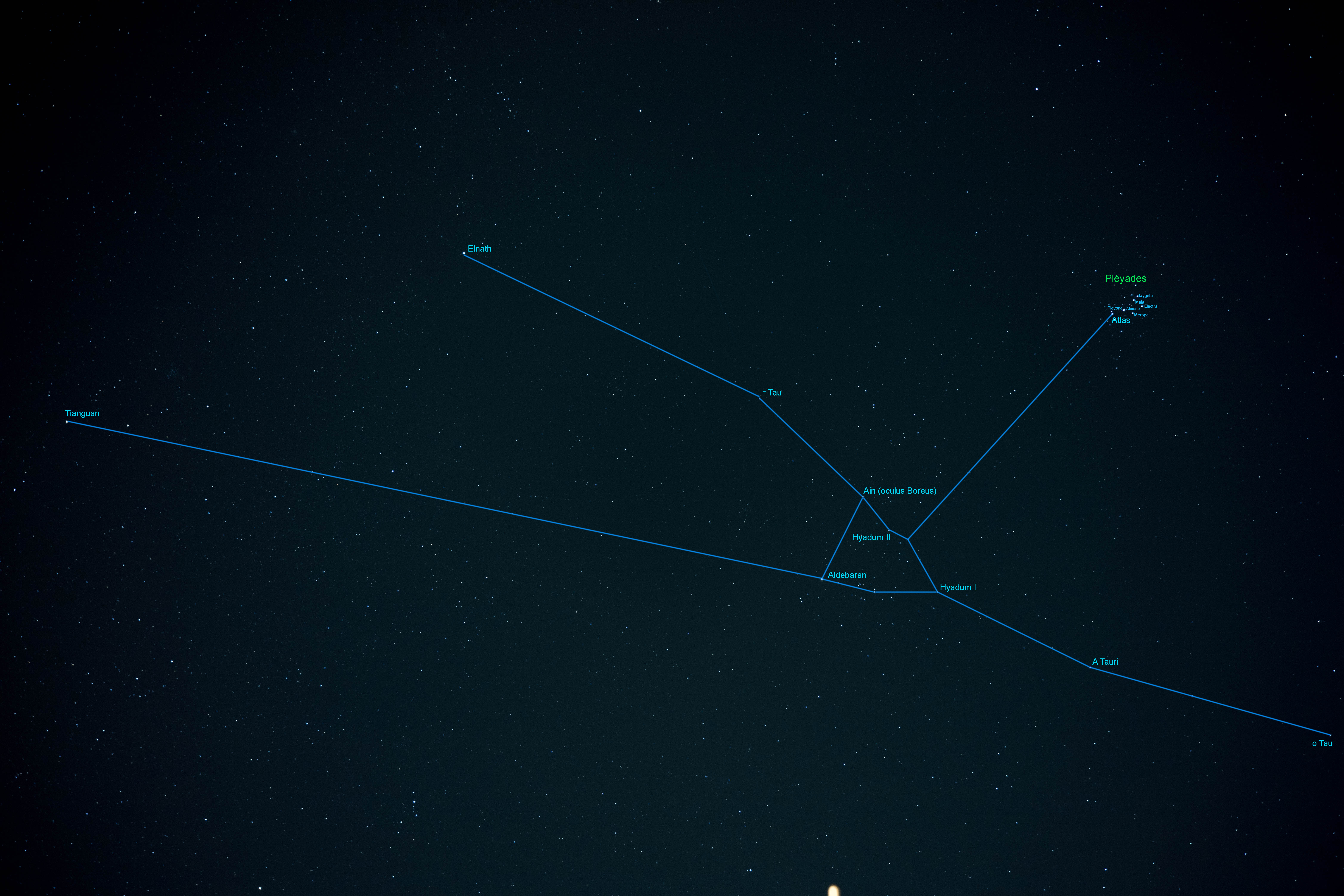 Muy característica es la forma de las estrellas que forman la cabeza del toro destacando Aldebaran que es el ojo del toro es la más brillante de la constelación y es una gigante naranja de primera magnitud. Su nombre significa "la que sigue" y hace referencia al hecho de que sigue a las pléyades en su recorrido a través del cielo. Las Híades es un cúmulo que forma la cabeza del toro. Hay que destacar que Aldebaran no forma parte de este cúmulo abierto.