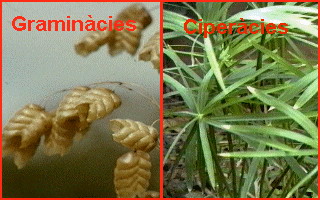 Ordre Ciperals. Totes són plantes herbàcies molt evolucionades i adaptades a la pol.linització del vent. Família ciperàcies gèn Cyperus Família gramínies