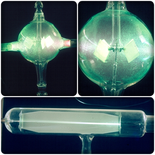 Si en un tub de buit es disposa d’un càtode foradat, els electrons en la seva marxa cap al ànode, colisionen amb les molècules gasoses i les ionitzen, determinant un flux d’ions positius que degut a le seva càrrega es dirigiran al càtode. Podrem observar una lluminositat en forma de franges. Es per això que Goldstein el seu descobridor els anomenà raigs canals. Si apropem l'imant a aquests raigs podrem veure que també es desvien però de forma contrària a com ho feien el catòdics. A finals del segle XIX el físic alemany Roentgen observà que apropant unes plaques fotogràfiques als raigs catòdics aquestes s’impressionaven a pesar d’estar tancades en el sobre de cartró. Ràpidament va comprendre que això no es podia deure als raigs catòdics sinó a la existència d’uns raigs misteriosos que es formaven al lloc on els raigs catòdics xocaven amb el vidre. Els anomenà raigs X. En aquesta experiència veiem una coloració blavosa que es deu a la formació d’aquests raigs. Si feim passar un corrent elèctric a través d’un gas s’obté una visió més clara dels electrons. Tots coneixem el color vermell dels tubs de neó. En aquets tubs es fa el buit i s’introdueix un gas. Segons la naturalesa del gas obtindrem els colors característics. Per tal de veure l’espectre que produeixen els diversos gasos emprarem un espectroscopi. L’element més important és el prisma que formarà l’espectre de colors. El col·limador es un tub amb una encletxa que es pot obrir i tancar a voluntat. L’ocular es un altre tub que du el conjunt de lents per augmentar la mida de l’espectre i fer-lo més visible. L’altre tub du una escala graduada que es projecta a través del prisma y es pot veure damunt l’espectre. D’aquesta mena, una vegada calibrat, es poden referir els colors a les distintes longituds de ona. L’estudi de l’espectre ha permès descobrir nous elements, com per exemple succeí en l’heli, que es troba abans al Sol que a la terra.