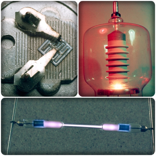 Thomas Edison, observà que la càrrega elèctrica brollava més fàcilment dins un gas a baixa pressió si s’escalfava un dels elèctrodes. D’aquest tub anomenat diode de buit sorgiren, afegint reixes entre els elèctrodes els tríodes, pèntodes i totes les làmperes de buit que són el principi de la moderna electrònica.