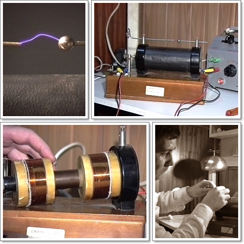 Donat que la variació es més ràpida en el moment de ruptura que en el de tancament el voltatge del secundari serà major en un sentit que en el sentit oposat. D’aquesta forma connectat a una font de 12 volts obtindrem una sortida de uns 12.000 volts. Per aquesta primera experiència emprem dues petites esferes a un centímetre de distància y connectades al rodet de Ruhmkorff. Es poden veure una sèrie de petites espurnes que boten d'una a l’altra esfera. Això es deu als impactes dels pocs ions existents amb les molècules d’aire amb la conseqüent formació de nous ions, augmentant la pròpia conductivitat. Si feim la descàrrega a l'interior d'un gas enrarit es produeix un efluvi amb zones luminoses que depenen de la pressió i naturalesa del gasos emprats. En aquesta experiència comprovarem que el raig de l'nterior de la ampolla es capaç de produir accions mecàniques i calorífiques. Els raigs catòdics impacten amb les làmines de mica molt lleugeres que formen el molinet i com es pot veure el fan voltar.