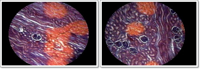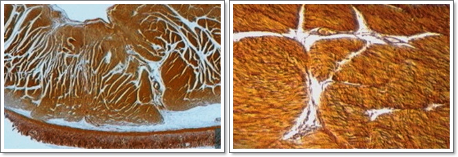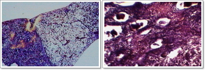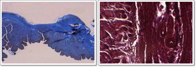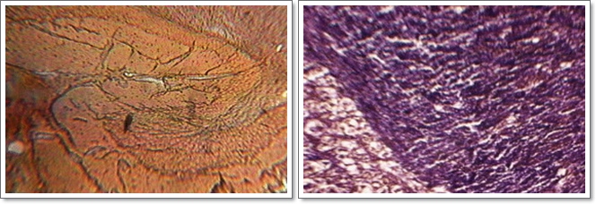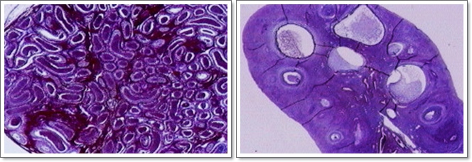 Ovari d'ovella És el lloc de formació dels òvuls, és a dir, la gònada femenina, i està constitu‹t per dues zones diferenciades: la zona medulúlar, molt rica en vasos sanguinis, i la zona cortical, on es poden apreciar gran quantitat de folúlicles de Graaf, que són els llocs on es desenvolupen els òvuls. (Dalt dreta).