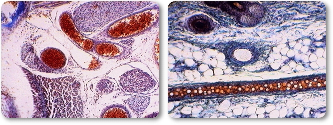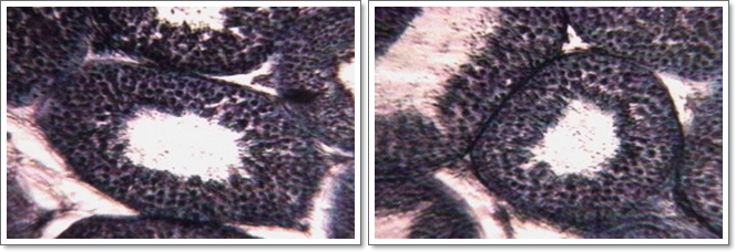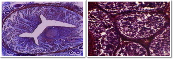 Testicle de porc Exemple representatiu de gònada masculina, perquè l'estructura dels testicles de tots els mamífers és similar i dissenyada a base de tres parts diferenciades: una coberta fibrosa i resistent, centenars o milers de conductes seminífers encarregats de la producció dels espermatozoides, que es troben en gran quantitat i envoltats, i l'estroma, que és un teixitconjuntiu lax molt vascularitzat. Les cèlúlules intersticials tenen funció endocrina i produeixen l'hormona masculina anomenada testosterona (Dalt dreta)