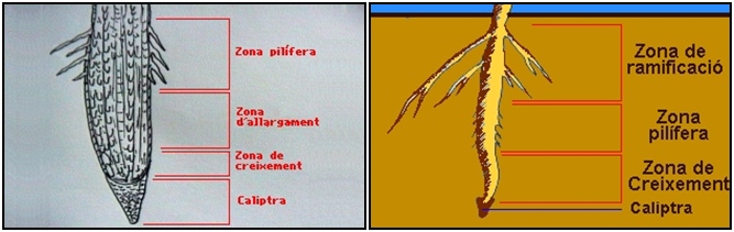 Per al seu estudi, dividim l'arrel en diferents zones, segons les funcions que es duen a terme en cadascuna: La zona terminal és la zona de creixement, allà on l'arrel creix en llargària. Està envoltada d'una estructura formada per cèl.lules de parets més dures i resistents, que protegeix les delicades cèl.lules encarregades de dividir-se i obrir-se camí. La zona de creixement es va allargant a mesura que la planta creix. A la zona pilífera es duu a terme l'absorció de nutrients.Malgrat que no sembli molt gran, la seva superfície és augmentada pels milers de pèls absorbents, expansions de les cèl.lules que capten l'aigua i les sals minerals, i es renoven constantment. Més amunt, trobam la zona de ramificació, d'on surten les arrels secundàries. Aquesta zona arriba fins al coll, que és la unió de l'arrel amb la tija. Les arrels creixen molt ràpidament, i és ben freqüent que la seva grandària sigui molt superior a la part aèria de la planta.
