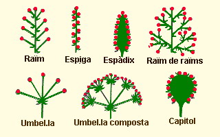 Les flors es reuneixen de diferents formes: La umbel.la: formada per nombrosos peduncles que surten tots del mateix lloc. Pot esser simple si cada peduncle acaba en una flor o composta si cada peduncle es divideix per formar altres petites umbel.les (umbèl.lules). El ra‹m és el resultat d'un eix principal al llarg del qual els peduncles queden inserits a diferent altura, si bé tots tenen la mateixa longitud. (Muscari) El corimbe és molt parescut al ra‹m però té peduncles de diferents longituds que es fan més llargs com més de baix surten. Això dóna com a resultat que les flors queden més o manco a la mateixa altura.