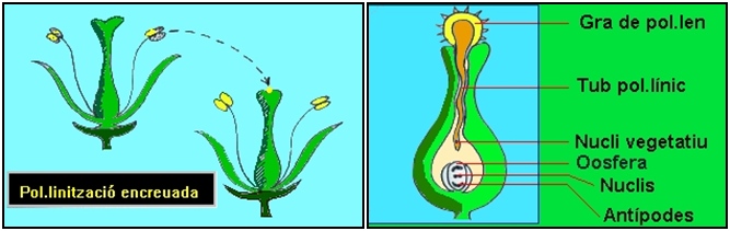 Després de produir-se la pol.linització, el gra de pol.len germina quan es posa en contacte amb els líquids produ‹ts per l'estigma. En resulta el gametòfit masculí, també anomenat tub pol.línic. Aquest gametòfit és originat per una cel.lula amb dos nuclis: un de vegetatiu i un altre de germinatiu. Aquest es divideix i dóna lloc a dos nuclis espermàtics que actuaran com a gàmetes masculins. Quan el tub pol.línic arriba a l'òvul penetrant a través del micròpil es produeix una fecundació doble, en la qual un dels anterozoides s'uneix a l'oosfera i origina un zigot diploide, i l'altre s'uneix al nucli secundari i forma una cèl.lula triploide. Finalment a la fase d'esporòfit el zigot dóna lloc a l'embrió i la cèl.lula triploide origina l'endosperma o albumen que serà el teixit nutritiu que servirà per a alimentar l'embrió.