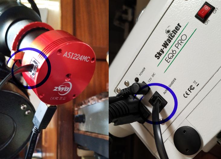 Conexiones a las cámaras y a la montura: Para las conexiones necesitamos un cable RJ-12 de 6 hilos, suministrado por el fabricante de la cámara y que deberemos conectar entre la salita ST-4 de la cámara y el puerto de Auto guiado de la montura. En mi caso la Sky Watcher EQ6 PRO.