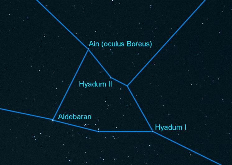 Muy característica es la forma de las estrellas que forman la cabeza del toro destacando Aldebaran que es el ojo del toro es la más brillante de la constelación y es una gigante naranja de primera magnitud. Su nombre significa "la que sigue" y hace referencia al hecho de que sigue a las pléyades en su recorrido a través del cielo. Las Híades es un cúmulo que forma la cabeza del toro. Hay que destacar que Aldebaran no forma parte de este cúmulo abierto.