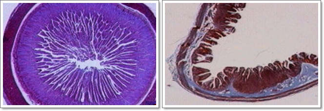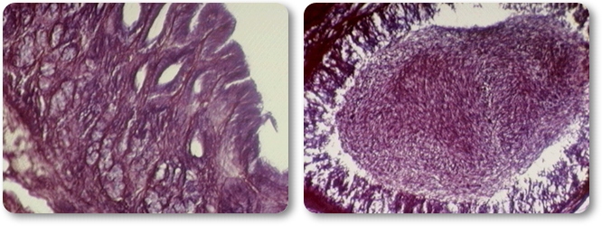 Ovari d'ovella És el lloc de formació dels òvuls, és a dir, la gònada femenina, i està constitu‹t per dues zones diferenciades: la zona medulúlar, molt rica en vasos sanguinis, i la zona cortical, on es poden apreciar gran quantitat de folúlicles de Graaf, que són els llocs on es desenvolupen els òvuls. (Dalt dreta).