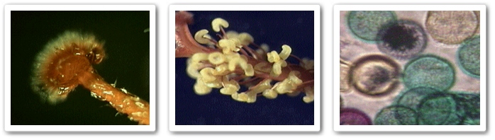 El gra de pol.len produ‹t per les anteres es desplaça fins a l'estigma. Aquest desplaçament rep el nom de pol.linització. Si aquest desplaçament es realitza entre elements de la mateixa flor es diu pol.linització directa o també autopol.linització; i si, al contrari, es realitza entre diferents flors deim que és una pol.linització indirecta oencreuada. El gra de pol.len és transportat per: L'aire (pol.linització anemòfila) i els insectes (pol.linització entomòfila). Després de produir-se la pol.linització, el gra de pol.len germina quan es posa en contacte amb els líquids produ‹ts per l'estigma. En resulta el gametòfit masculí, també anomenat tub pol.línic.