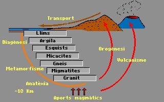 Metamorfisme i cicle petrogenètic: Les roques de l' escorça terrestre es transformen pràcticament unes en altres al llarg del temps, seguint l'esquema que s'ha denominat cicle petrogenètic. El tancament del cicle petrogenètic principal es produeix per efecte de la continuació dels processos metamòrfics a l'interior de la litosfera Si el metamorfisme regional continua, pot produir-se la fusió parcial de les roques metamòrfiques, que donen lloc a un fluid magmàtic, que en refredar-se en condicions plutòniques, pot donar lloc a roques intrusives de tipus granític, si el líquid és de composició granítica. En relació amb el cicle petrogenètic, el metamorfisme dóna lloc a tres importants tipus de processos: - Anatèxia.- L' anatèxia consisteix en la fusió natural de les roques en les zones més profundes de l' escorça terrestre. - Migmatització.- La migmatització és un procés en el qual trobam dos components distints. Per una part, un material fos, per regla general denaturalesa granítica, juntament amb una roca hoste preexistent, que no ha perdut les característiques metamòrfiques (lineació, orientació general delsminerals, etc.). Si el procés de migmatització és molt elevat, a causa deles condicions existents, les estructures residuals metamòrfiques poden desaparèixer, i les migmatites esdevenen anatexites o granits d'anatèxia. - Granitització.- El metamorfisme a grans profunditats és un procés lenti inexorable, que a poc a poc va afectant tota la massa, i és el responsable de la formació dels cratons (masses de l' escorça que formen la base dels continents). El final d'aquest procés metamorfitzador és la formació de granit a les zones profundes. Actualment hi ha una polèmica que intenta dilucidar quin és l'origendels grans batòlits granítics: magmàtic o per granitització. S'ha arribat a la conclusió que les explicacions han de ser dobles: hi ha granits que semblen haver-se format a partir de magmes líquids, i altres per mitjà de fenòmens metasomàtics Cada un dels grups que defensen ambdues possibilitats accepta l'explicació alternativa, però assignant-hi el 85% dels casos a la idea defensada per ells.
